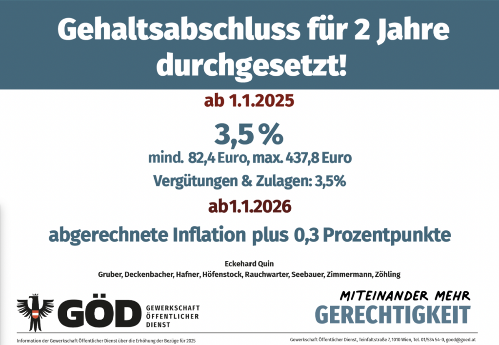 Unserem GÖD-Vorsitzenden Mag. Dr. Eckehard Quin ist es mit seinem Verhandlungsteam gelungen, für uns alle einen Gehaltsabschluss für 2025 und 2026 zu erzielen.